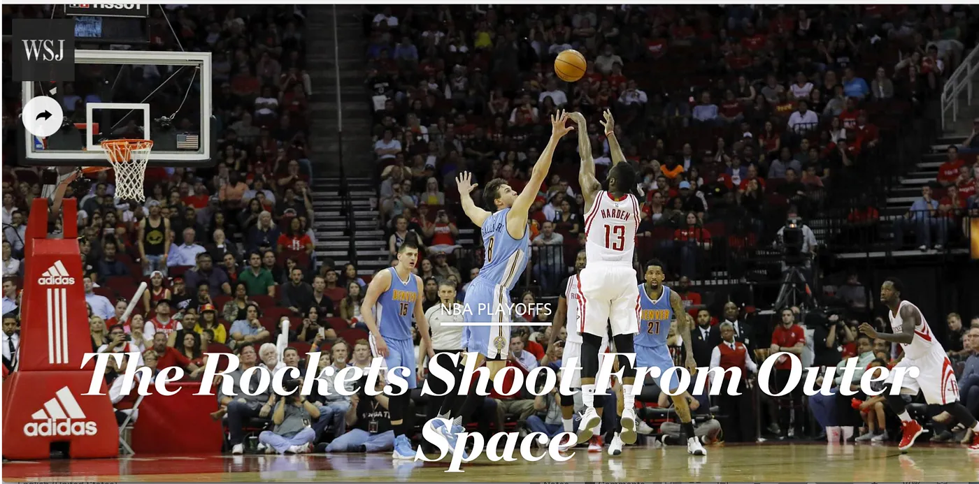 After reviewing (and discussing) GTM metrics for SaaS companies, I just read an interesting article in the WSJ today about the NBA: “The Rockets Shoot from Outer Space — Houston has changed the NBA by finding a way to take more 3-pointers: take longer 3-pointers.”