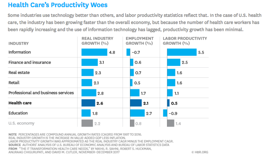 One reason for this is that Healthcare is a very transactional industry. Each interaction among patients, providers, payers, pharmacies, pharmaceutical companies and other healthcare professionals is measured by the potential for reimbursement and managing costs. Therefore, digital health platforms so far have focused on optimizing existing workflows rather than improving or replacing them. The push for value-based care should change this, but it has been slow going so far. As a result, productivity growth in the industry is one of the slowest despite robust employment growth.