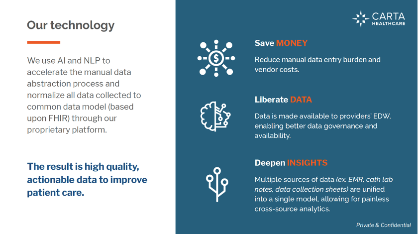One of the first use cases being addressed is registry creation and management. The Carta platform can complete and update the vast majority of registries automatically. Furthermore, new registries can be created to track rare diseases and procedures much more easily.