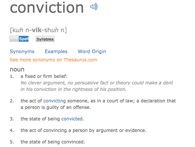 If you scoot on over to dictionary.com and search for the word “conviction” you get the following definition:
