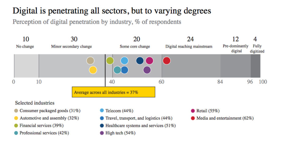 After analyzing the digital penetration in various industry sectors, Bughin noted that the average penetration is only 37%, as shown below: