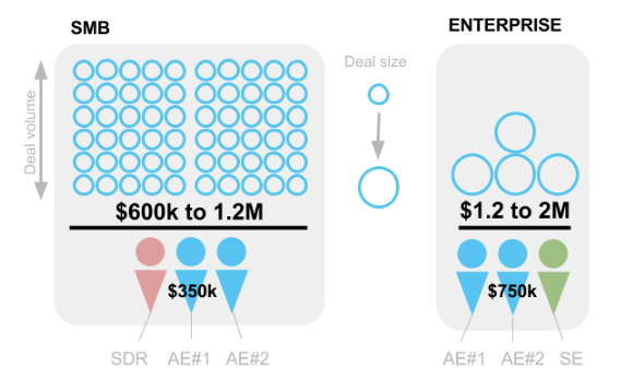SMB: ACV $10k, 4:1 win ratio, sales cycle of 30 days — Per SMB AE you can work 10 opportunities, for 2–3 wins per month = 30 wins per year = ~$300,000/AE. LTV is a lot shorter anywhere from 1–2 years. $300–600k. For two AEs in SMB you need one SDR. Total comp for 1 SDR and 2 AEs ~$350k. But you will need sustainable volume of leads!