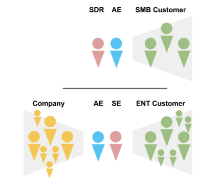 In a SMB deal the SDR develops the lead, and the AE works with a few people on the SMB customer side. The SMB sales process feels like a soccer team, where midfielders (Red SDRs) are passing the ball forward to the striker (AEs). The interaction is primarily between the AE with the client.