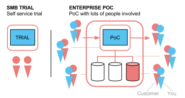 In a SMB trial the client is primarily interested in understanding the service and the benefits it can bring to them. In an Enterprise PoC you will run into a lot of people who are involved to reason WHY NOT to use your service. In the example above you will notice that in the enterprise PoC you have someone before & after you in the workflow, someone responsible for the integration, someone responsible for the data model, someone for the overall solution and ofcourse someone who looks at the trial itself.