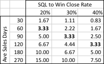 After discussing the formula with others, one question immediately comes up — does the formula still work if companies define pipeline differently (some after SQL, opportunity, etc). The nice attribute of the formula is that the formula adjusts for the pipeline definition — using a later stage definition reduces the ave sales days and improves the close rate, but lowers the overall pipeline number.