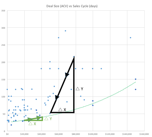 If the company has a fast sales cycle, it makes sense to increase the price to test the impact on the sales cycle. This scenario is illustrated by the green triangle (where the slope (Y/X) is substantially less than 1.0).
