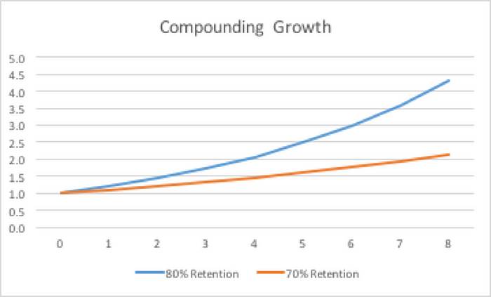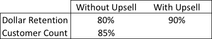 Reducing the $ retention rate (without upsell) from 80% to 70% reduces the company’s revenues by 35% after 5 years and by 50% after 8 years (assuming a new business growth rate of 40%). Please see the chart to the left.