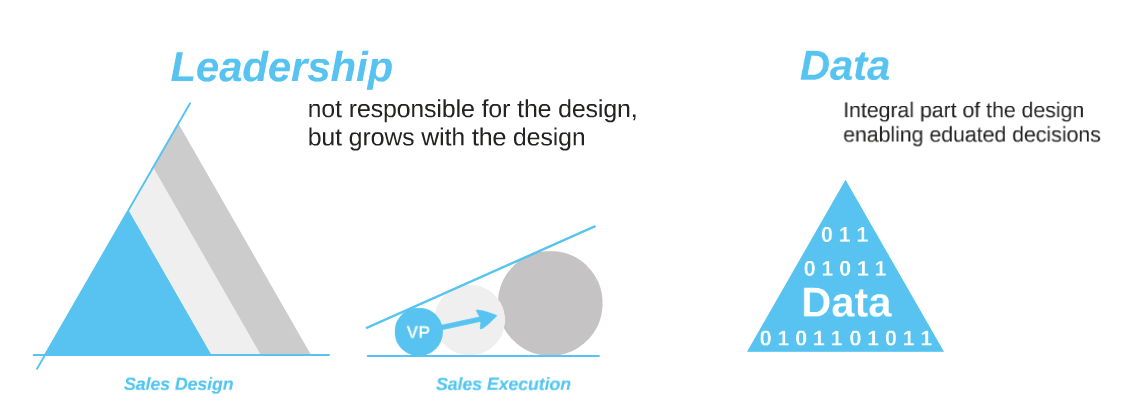 By separating the sales design from the sales execution you are able to build a sales organization that is focused on the client’s and organization’s needs. You can then bring on the right sales leader to execute that design, at any given point during the company’s lifecycle, and not having to do a restart with every hire. Data is used as the mortar between the 5 elements, and each block that is part of the design. It acts as a single source of truth, eliminating debates on topics such as lead quality, sales performance, marketing campaign efficiency etc.