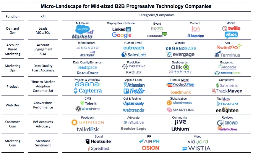 The following is provided as an example of a micro-landscape for a specific company type (B2B), size (mid-sized), maturity (progressive) and industry (technology) with company logos that meet minimum customer traction.