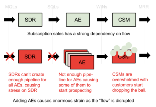The challenge with this model is that in subscription sales to generate sales, you need to win deals or rather MRR in volume. And this requires other critical functions — especially in a high velocity environment where AEs are winning deals in 30 days or less.
