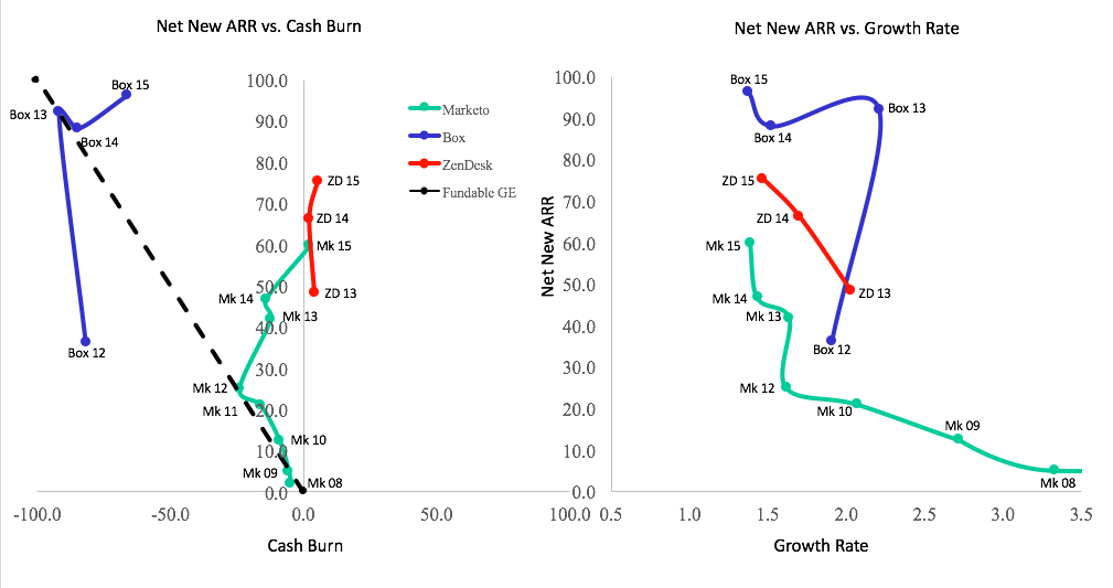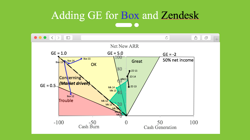 The chart above shows the relationship between GE and growth rate for Marketo, Box and Zendesk. Today, we expect more companies to mirror the growth rates of Marketo and Zendesk. That is, they spend less to acquire their growth. The bar, simply put, is just higher.