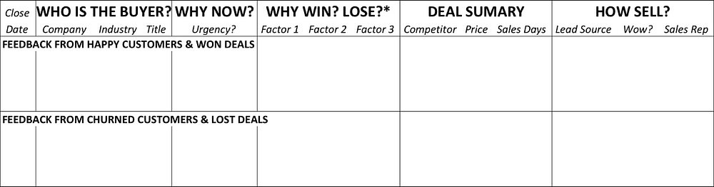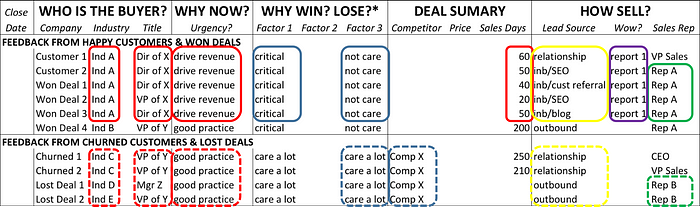 Ideally, happy customers and wins can be grouped to visualize patterns of success, and churned customers and losses can be grouped to visualize patterns of failure.