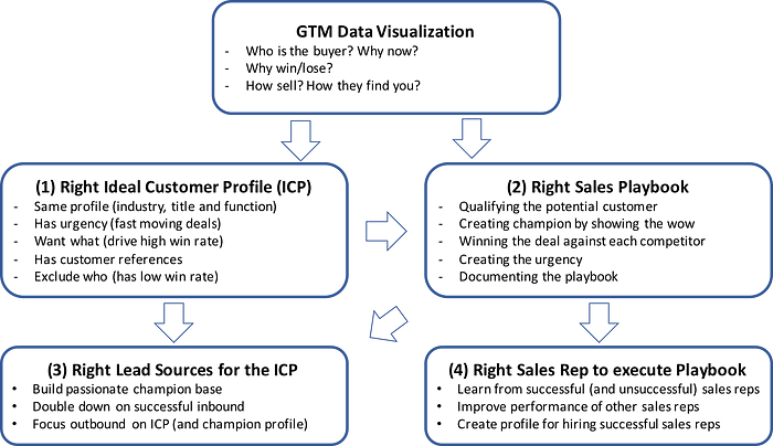 Then, use the GTM data to start answering the 4 key GTM questions: (1) identifying the right Ideal Customer Profile and (2) making the right sales playbook, and then (3) pursuing the right lead sources for the ICP and (4) hiring the right sales reps to execute the playbook.